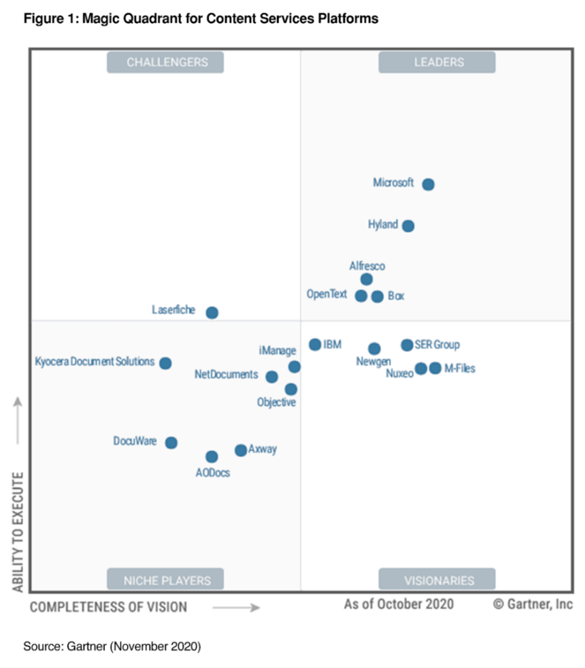 For the fourth year in a row Gartner has recognised Microsoft as a Leader in the Content Services Platforms Magic Quadrant for 2020, obtaining the highest place in ‘Ability to Execute’ and is placed higher on both ‘Completeness of Vision’ and ‘Ability to Execute’ than any other company in the Leaders’ quadrant.