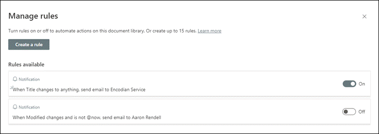 - From the Manage rules page, you can see the rules that have been created. From within here you can turn on or off a rule or create a new rule.