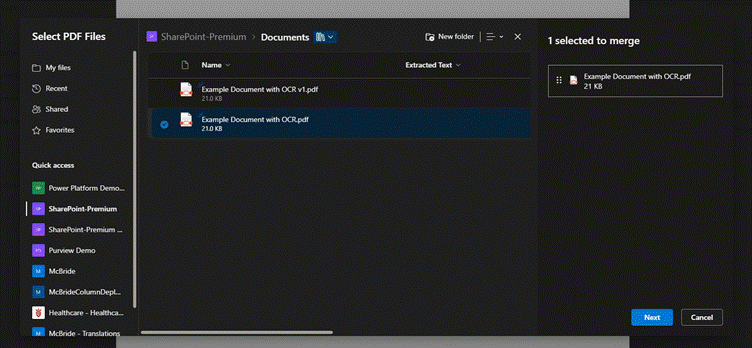 - Merge and Extract PDFs – SharePoint Premium simplifies PDF management by enabling the consolidation of multiple documents into a single file, using the merge feature.