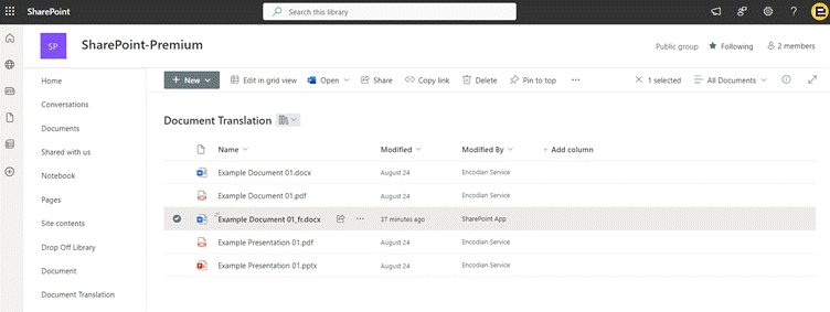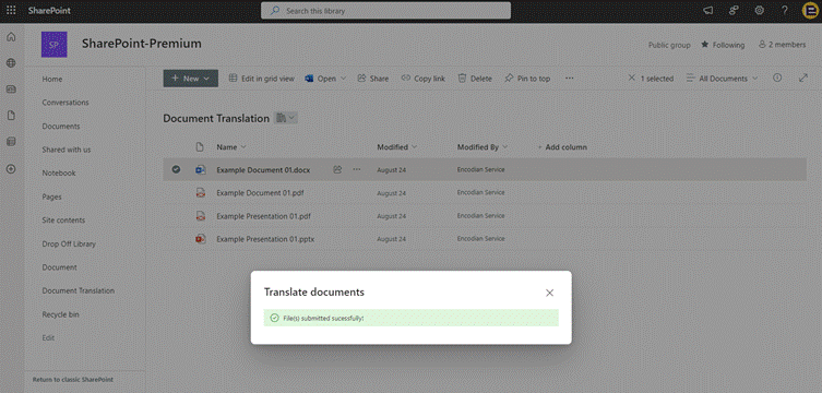 The translated file may take a few minutes to generate. Once ready, it will show up in the document library.