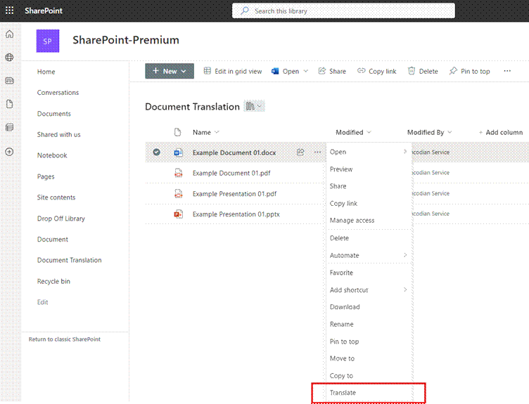 Figure 8.2 – SharePoint document library highlighting the ‘Translate’ option from the menu for a selected document.