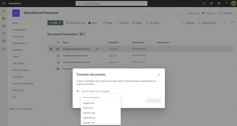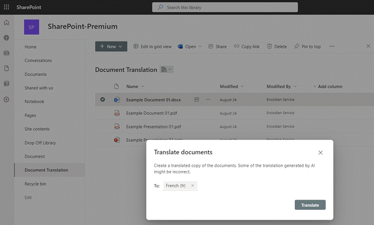 Microsoft SharePoint Premium allows you to easily create a translated copy of a selected file or a set of files from within a SharePoint document library and from within OneDrive for Business.