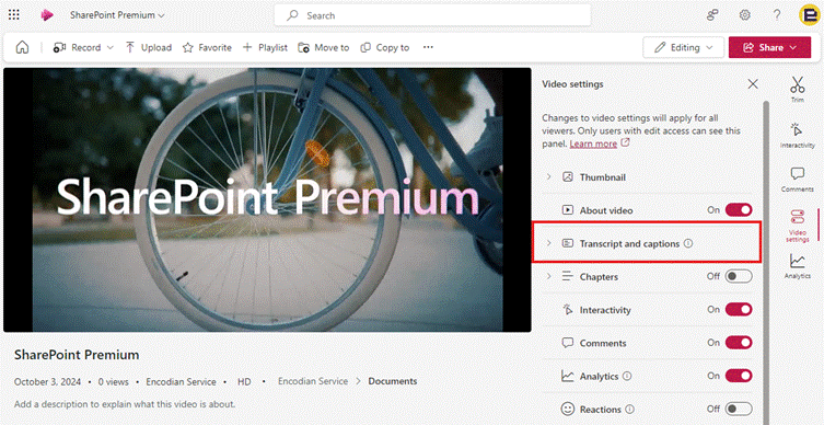 By default, the Video Transcription Translation service is turned on for all libraries in all SharePoint sites. Whilst this is the easiest configuration option and enables the functionality consistently across the organization, each translation incurs a cost which should be taken into account.