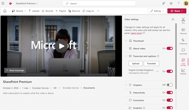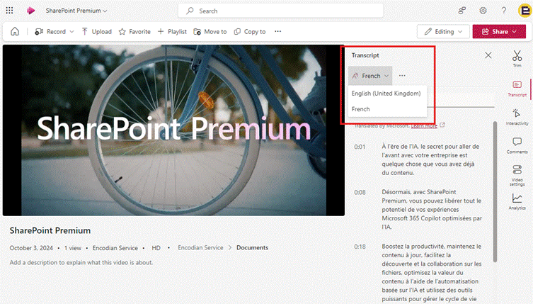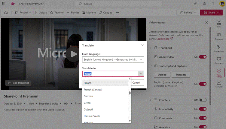 The Video Transcript Translation feature allows users to translate video transcripts and closed captions into 1 of the 100+ languages available within the SharePoint Premium Translation services.
